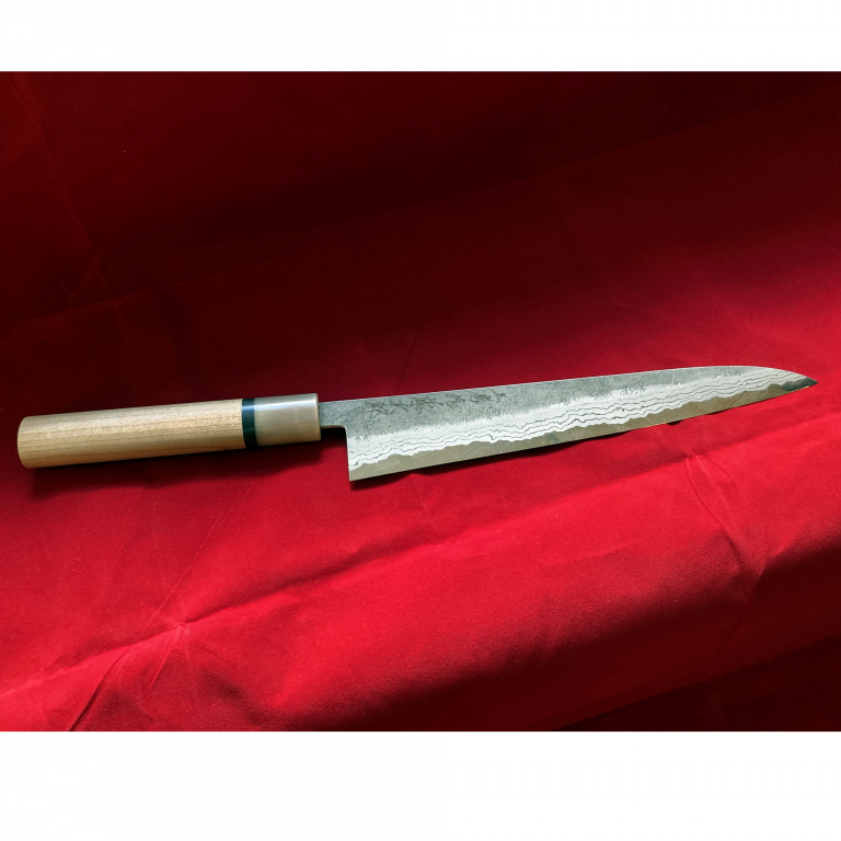 Sujihiki-kniven är den japanska motsvarigheten till en klassisk trancherkniv, utformad för att skära tunna, jämna skivor av kött och fisk. Det långa, smala bladet skär lätt genom råvaran utan att slita sönder fibrerna, vilket ger vackra snitt.