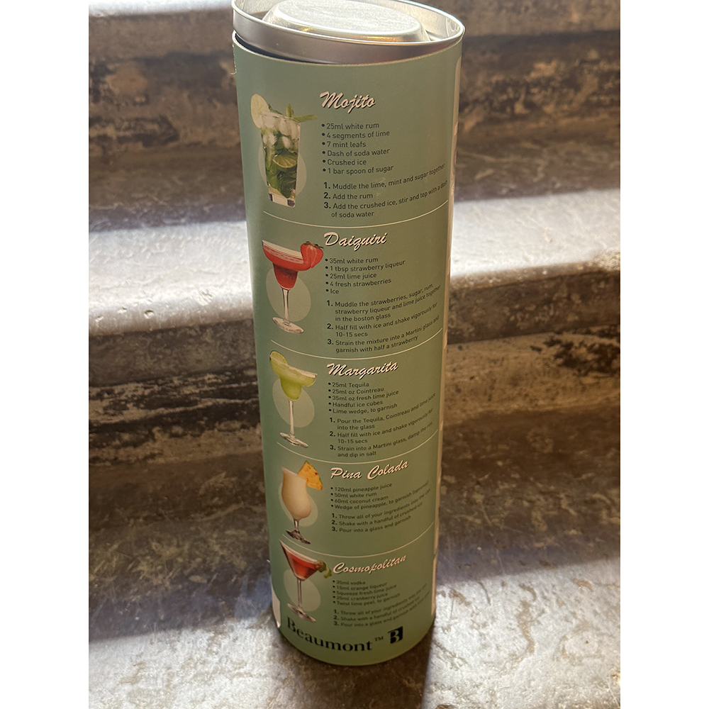 Allt ligger packat i ett rör som dessutom har recept på några klassiska drinkar: