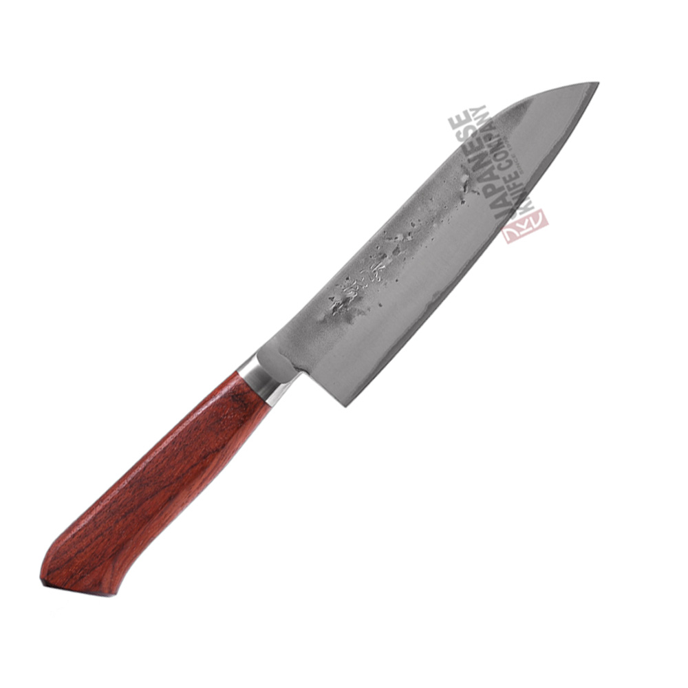 Aogami betyder bokstavligen ”Blue steel” Aogami har en mycket hög kolhalt något som ger stålet fantastiska egenskaper. För att ge bladet tålighet är kärnan insvept i ett mjukare stål på vardera sida. Dessa knivar är helt handgjorda med ett handtag i bubinga trä så färgen kan variera, kniv från kniv.