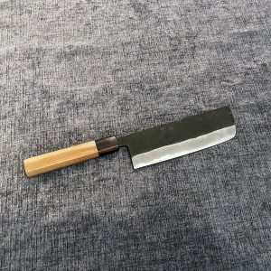 Kärnan i detta blad är omgärdat av rostfritt stål så att oxidation mot råvaror minskar, så även viljan att rosta. Kärnan i Aogami super har extra förmåga att hålla sin egg och ger det finaste av snitt. I tillägg är just Aogami ett lätt stål att slipa trots sin hårdhet på 62-64 HRC. Bladets tunna profil ger dig en nästan otäck skärupplevelse och är Shiro Kamos signum.