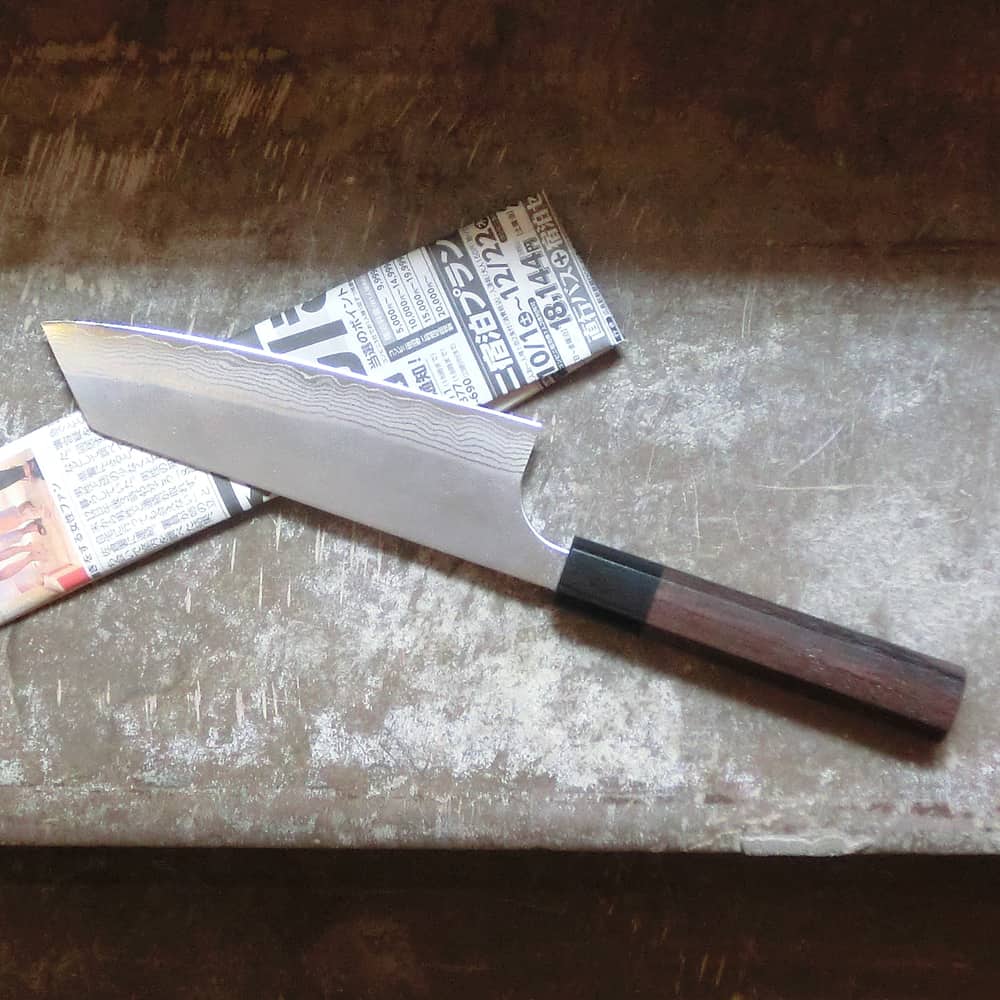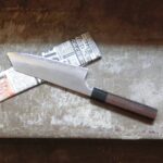 En handgjord kniv från Takefu Knife Village och Masakage gänget. Kärnan i denna kniv håller en hårdhet på 60 – 62 HRC i stålet VG10. Just stålet VG 10 är ett rostfritt stål i mycket hög kvalitet och ett vanligt val i Damaskussmiden. Ringen mellan handtaget och bladet är i ebenholts och handtaget i rosenträ.
