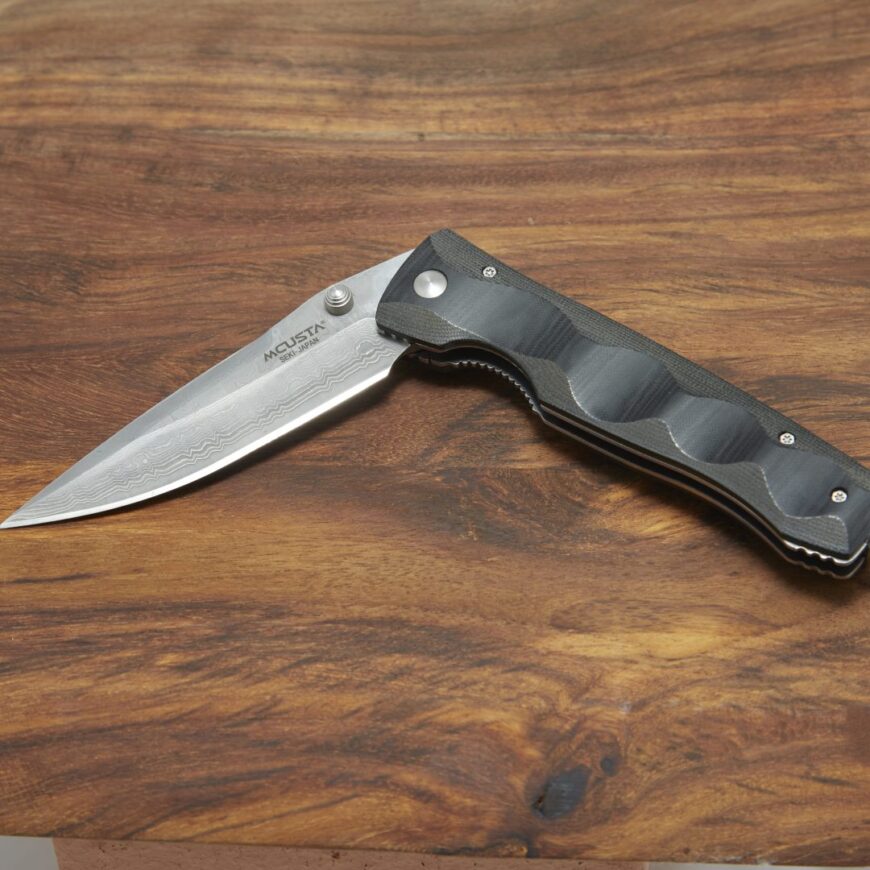 Mcusta Ebony – en vacker kniv med svart micarta i skaftet. Skaftet har djupa oliver för ett stabilt grepp. Bladet är ett damaskussmide i 33 lager med VG10 custom stål i kärnan. Spärr som hindrar bladet från att fällas ihop vid användandet.