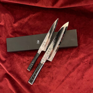 Vi kallar den “Sonens kniv” eftersom detta är verket från Tomo-san, son till Yasuo-san. En tunn kniv som är extremt lätt. Smidd i 33 lager av damascusstål med Mahogny handtag. Som vanligt ett oklanderligt hantverk från Mcusta / Zanmai. Deras 33 lager med custom VG10 är en klassiker och i deras tappning är det alltid något extra då deras smide och produktion skiljer sig från allt i Seki.