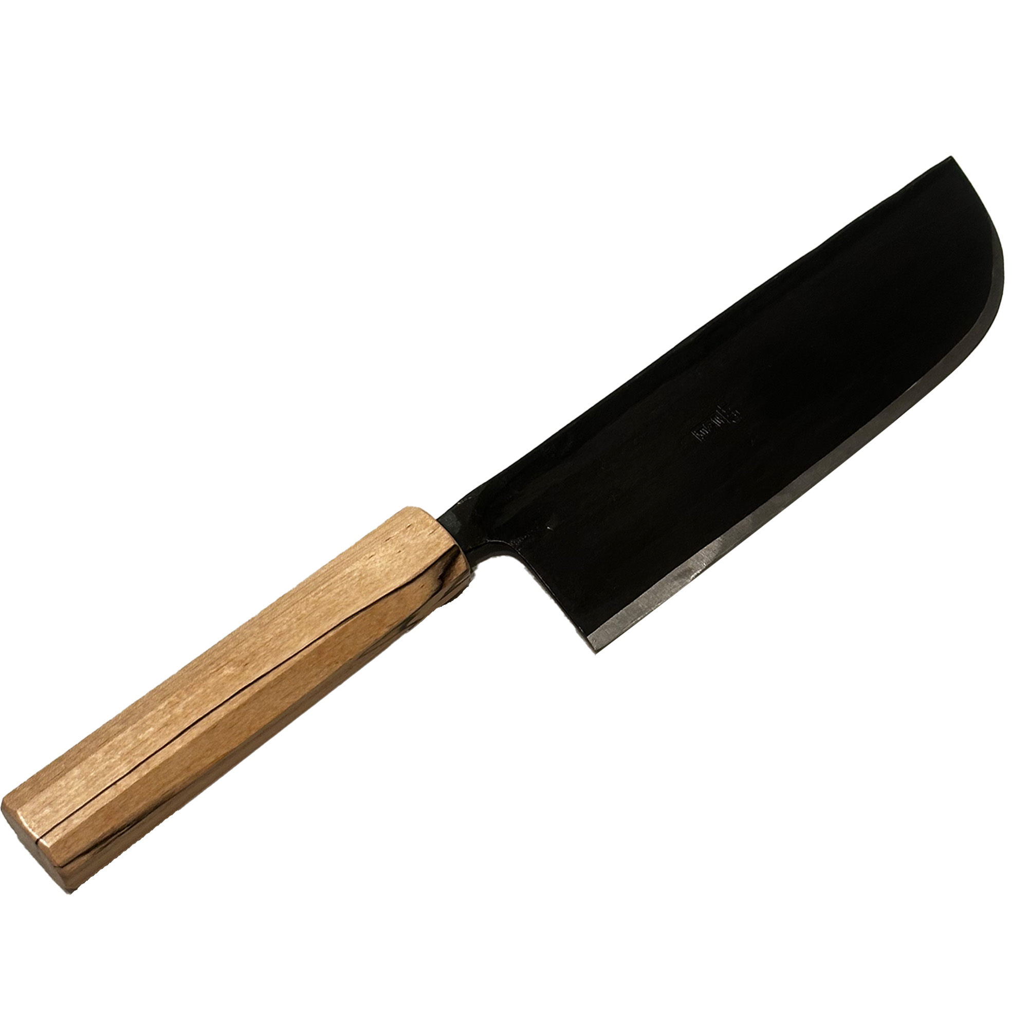 Suzuki Uchi Hamono är en känd japansk smidesverkstad som leds av Tsukasa Suzuki, känd för sina exceptionella färdigheter i att smida unika köksknivar. Suzuki San kommer från prefekturen Yamagata, en region känd för sin långa tradition av smide. Suzuki San lärde sig smideskonsten av sin far och har utövat det i mer än 40 år. Han skapar unika köksknivar som skiljer sig från standardformerna. Hans knivar är vanligtvis enkelslipade, vilket innebär att de bara har en slipfas på ena sidan av bladet. En fördel med denna geometri är dess förmåga att få mat att falla bort från bladet med minimal ansträngning, en funktion som är särskilt användbar vid precisionsskärningsuppgifter, där kockens kontroll över snittet är avgörande. Bladen har en distinkt bladtjockleksprofil, ryggraden, som Suzuki-San refererar till som “örat” på kniven, är relativt tjock runt 5 mm, medan resten av bladet är extremt tunt endast lite drygt 1 mm. Den tjocka ryggraden ger styrka och styvhet och hjälper också till att få råvaran att släppa från bladet. Extrem tunnheten tar skärpan till kirurgiska nivåer och ger ett rakt skär trots sin enkelsliping. För högerhänta. Tål inte diskmaskin.