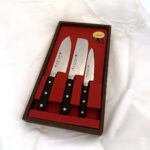 En perfekt gåva till de flesta, inte minst till de unga vuxna, studenter eller de som flyttar hemifrån. En bra kniv är alltid en användbar gåva. Detta set kommer i från Japan och innehåller tre stycken modeller; Nakiri, Santoku och Petty.