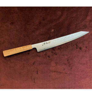 Urushi Aogami Super collection, helt handgjord i familjesmedjan av Master Fuki. Kärnan är i Aogami super, aka Blue Steel, laminerat i rostfritt stål som gör att kniven till stor del är rostfri. Kärnan oxiderar om den inte farvaras torrt. Skaften är lackerade i 10 lager av Urushi lack vilket givet namnet till serien. Skaft: Urushi Lacquer Kärna: Aogami Super. Steel Layers: 3 layers Hardness: 63+/-